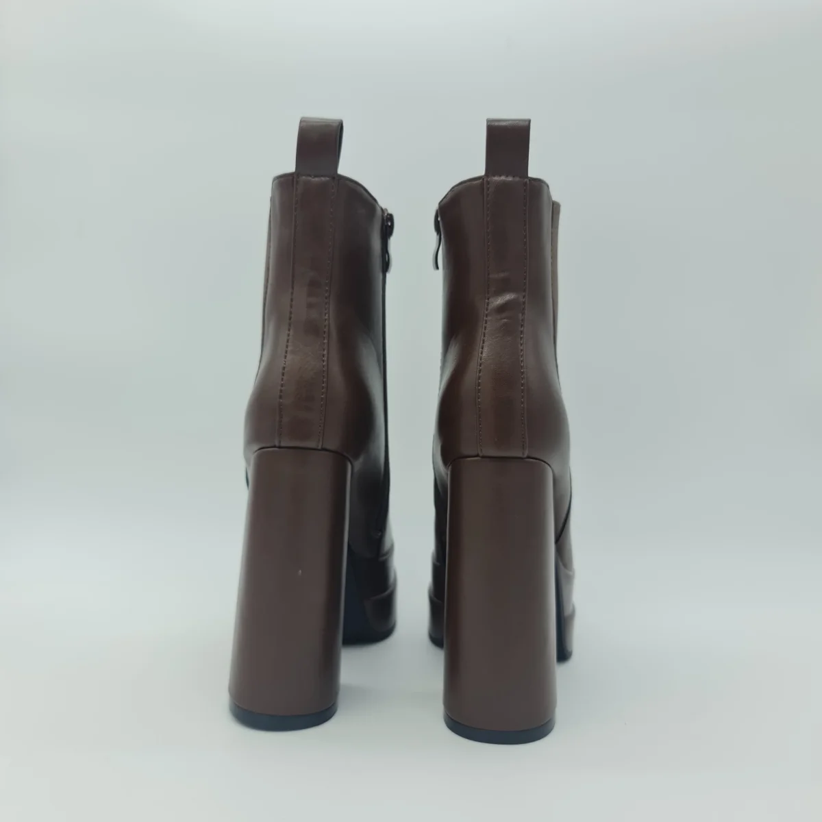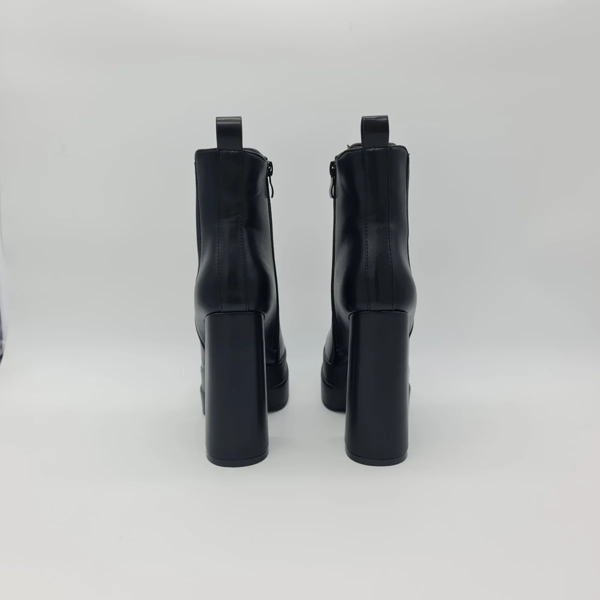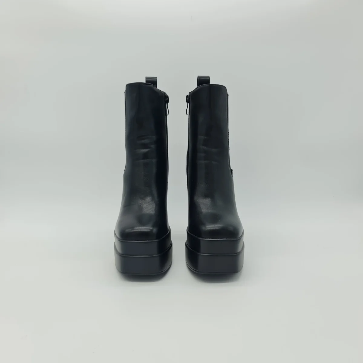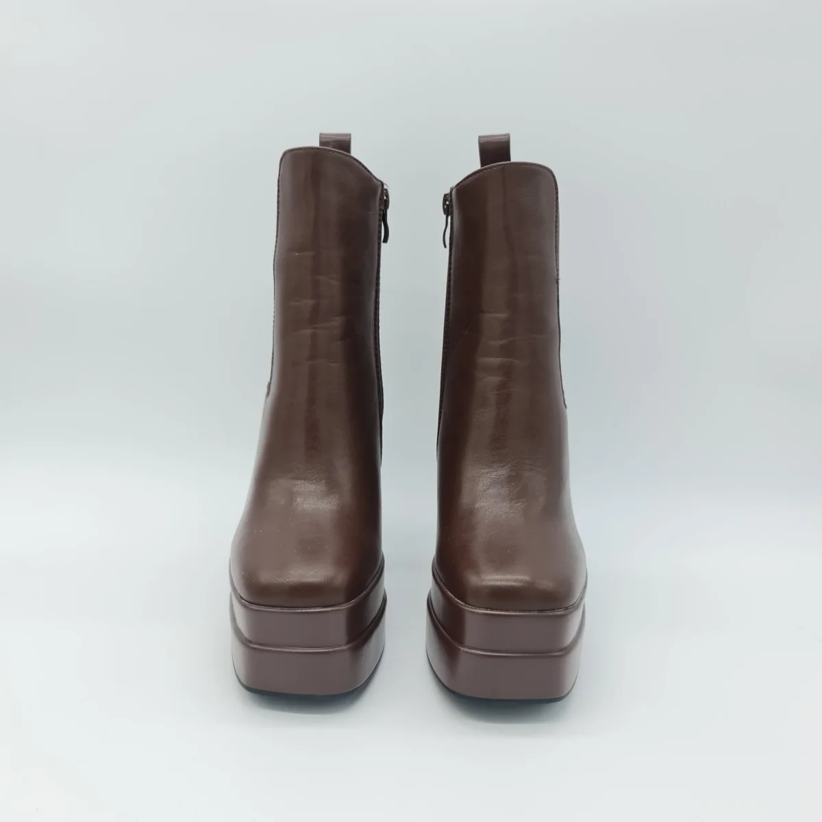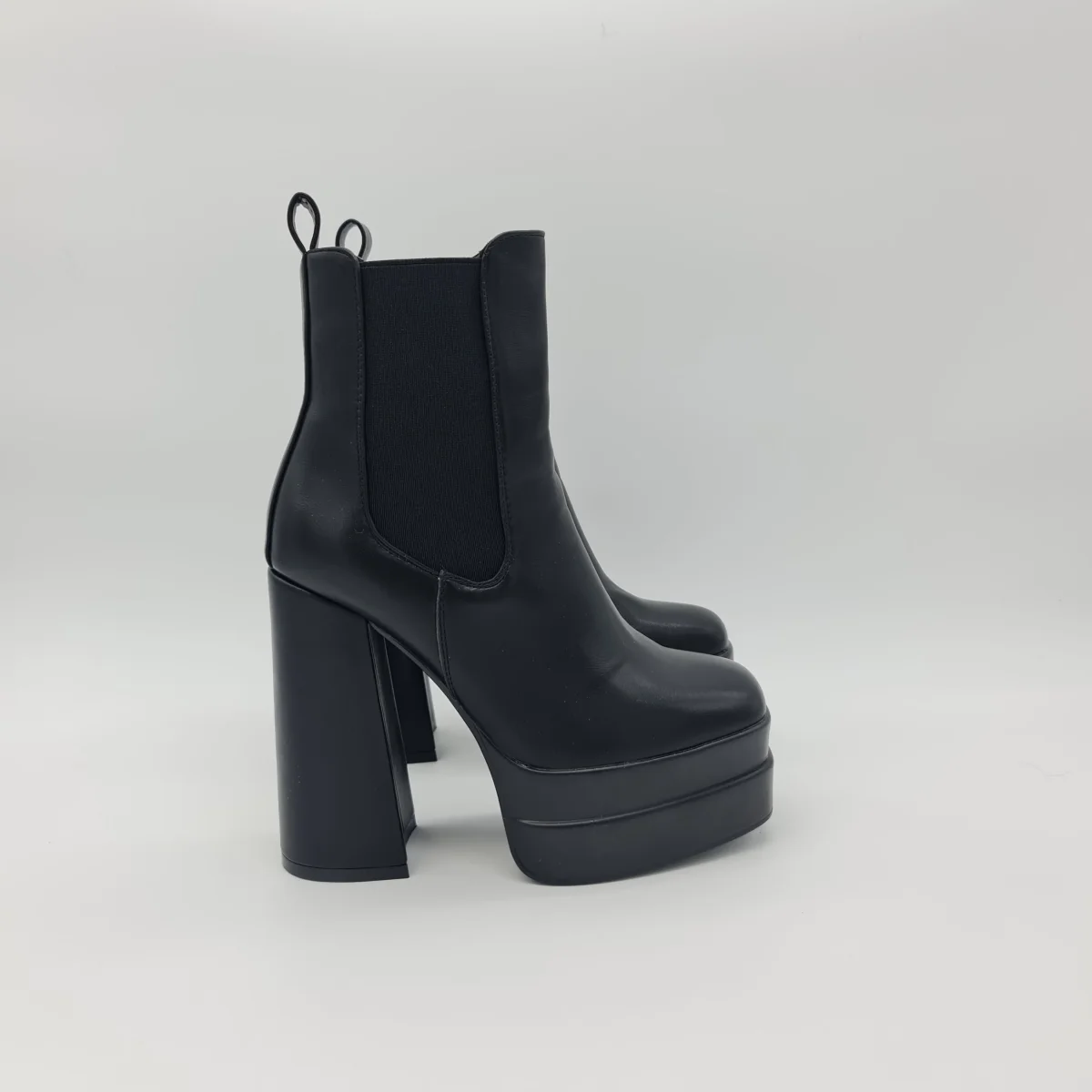 Stivaletto ecopelle con plateau alto 5 cm, elastico laterale e zip sul lato interno, tacco quadrato alto 13 cm, altezza stivaletto ( compreso di tacco) 27 cm.