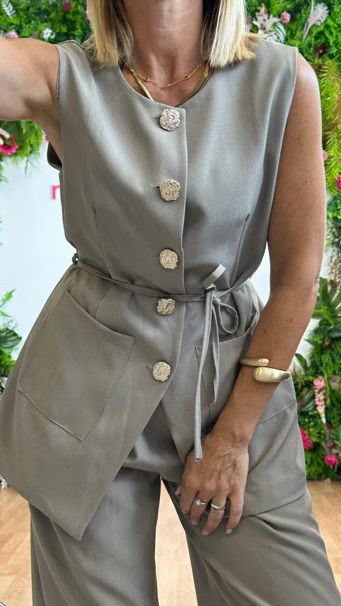 Il Tailleur Giorgia รจ un completo audace e raffinato, composto da un gilet con cinturina in tessuto e raffinati bottoni dorati, che sottolineano la silhouette con carattere. I pantaloni, dotati di elastico in vita e pratiche tasche, uniscono comfort e stile senza compromessi. Perfetto per chi vuole distinguersi con sicurezza ed eleganza contemporanea.