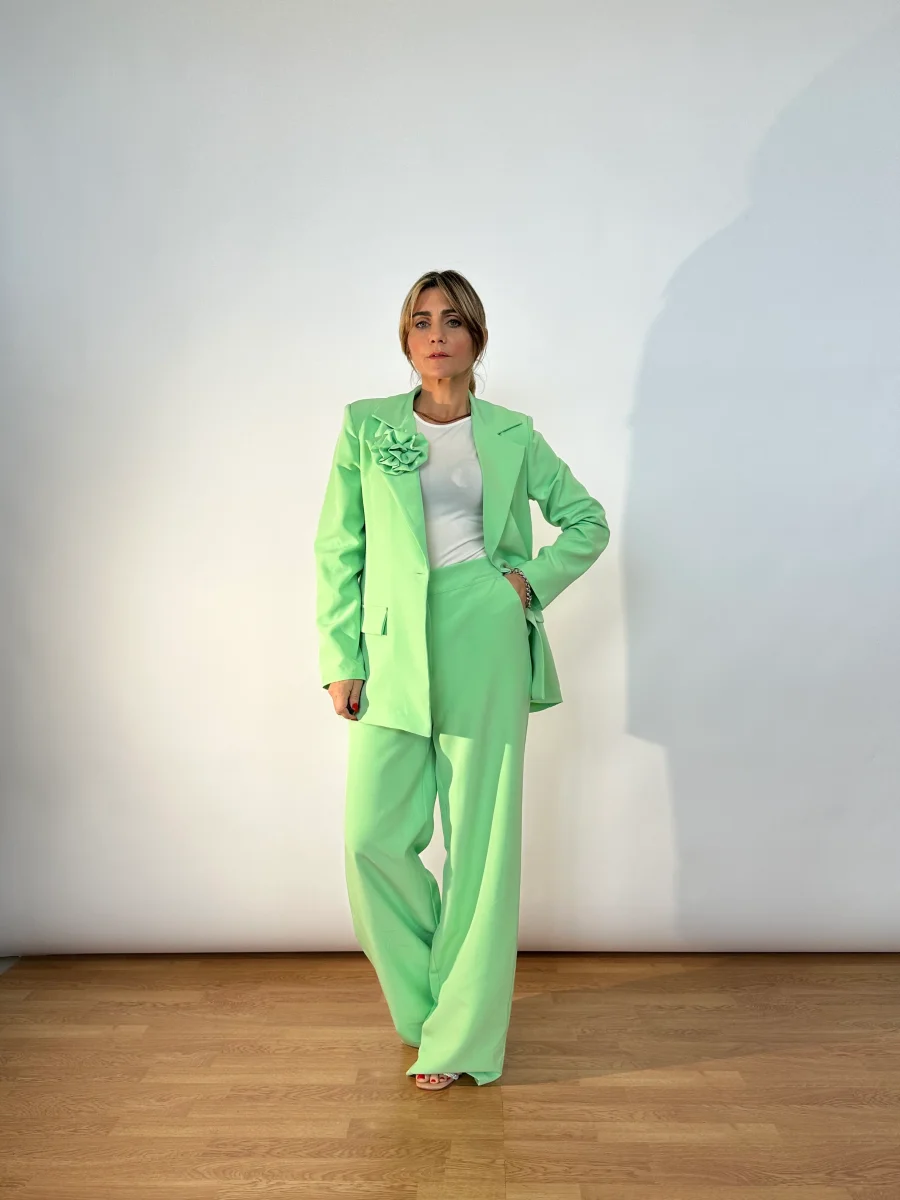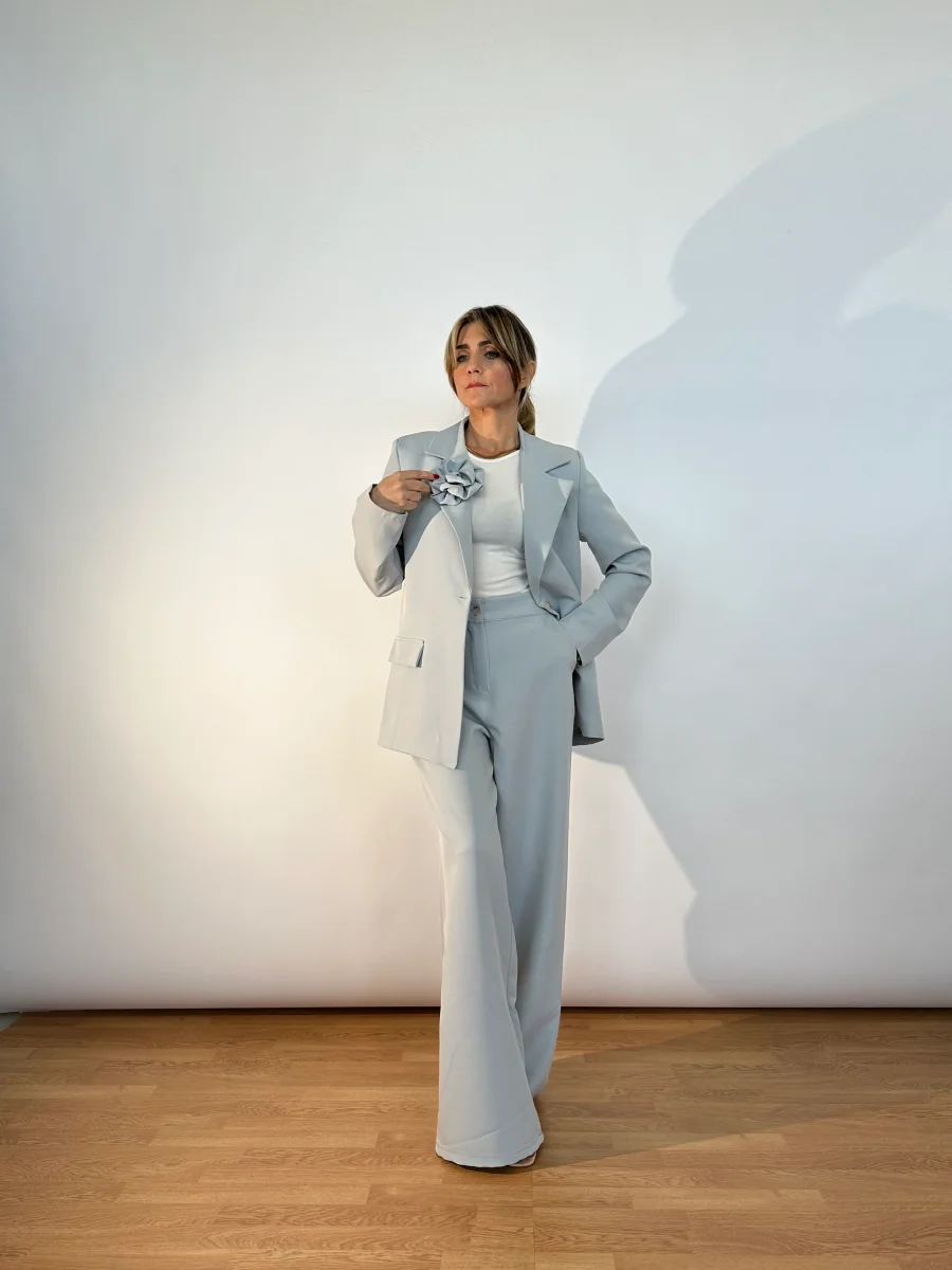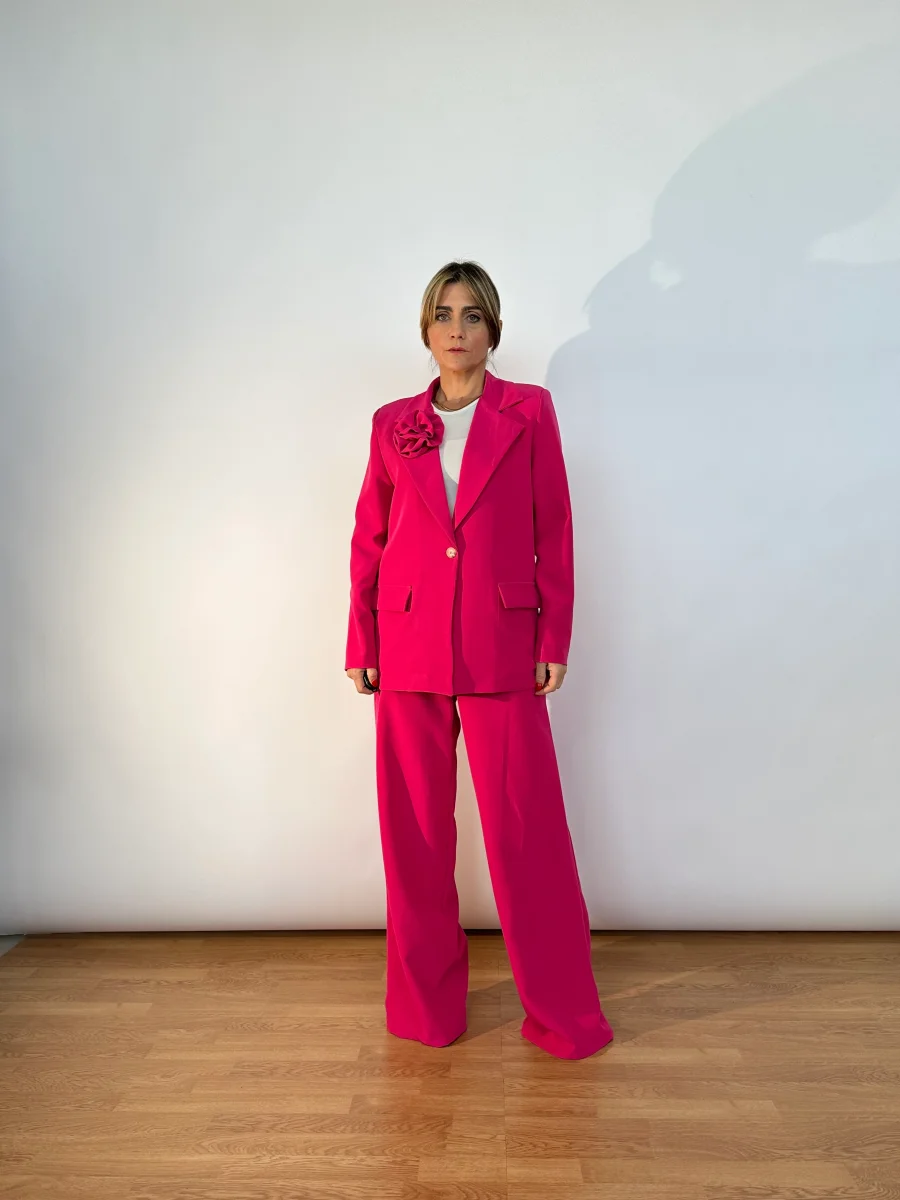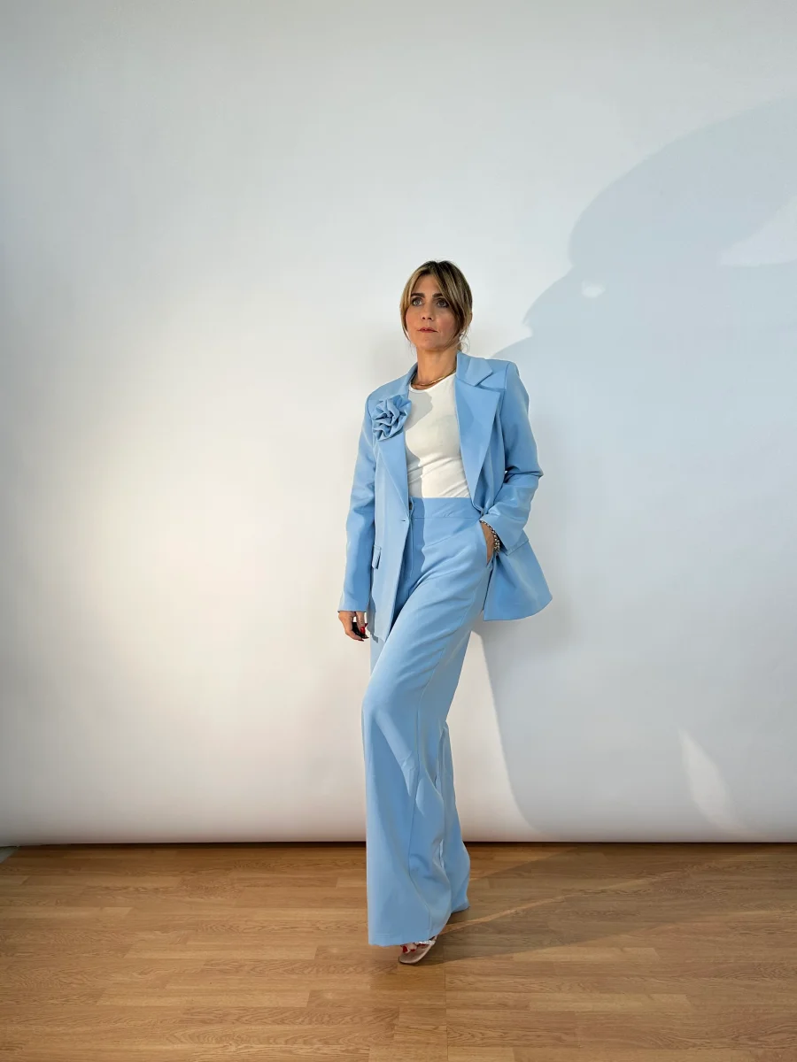 Tailleur made in Italy composto da giacca foderata dal taglio classico, monobottone, spillo sul bavero, lunghezza media e pantaloni wide leg con banda elastica sul retro, tasche laterali bottoncino e zip frontale.