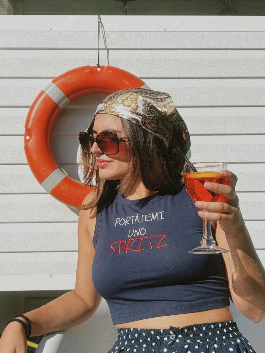 PORTATEMI UNO SPRITZ 100% COTONE COLORE: BLUE NAVY Top elasticizzato che compre da una taglia S ad una L MISURE NELLE FOTO