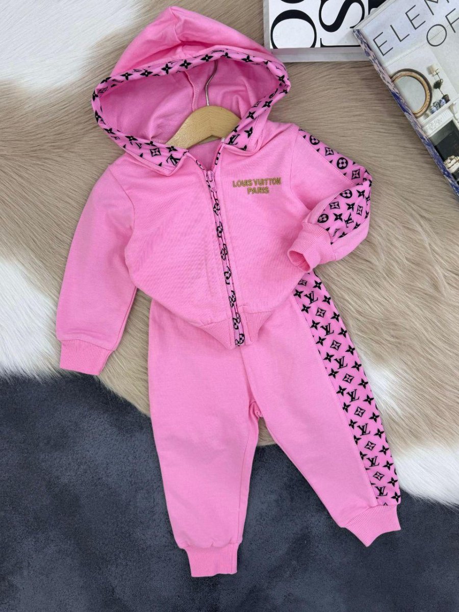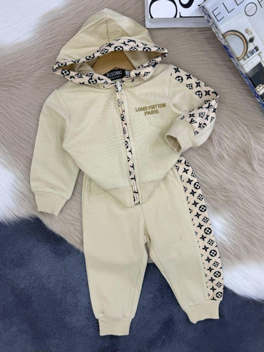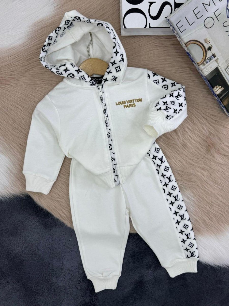 Tuta felpata per bimbi, composta da due pezzi: pantatuta con elastico in vita e alla caviglia felpa con cappuccio e cerniera, elastico nei polsini. Disponibile in tre varianti di colore.