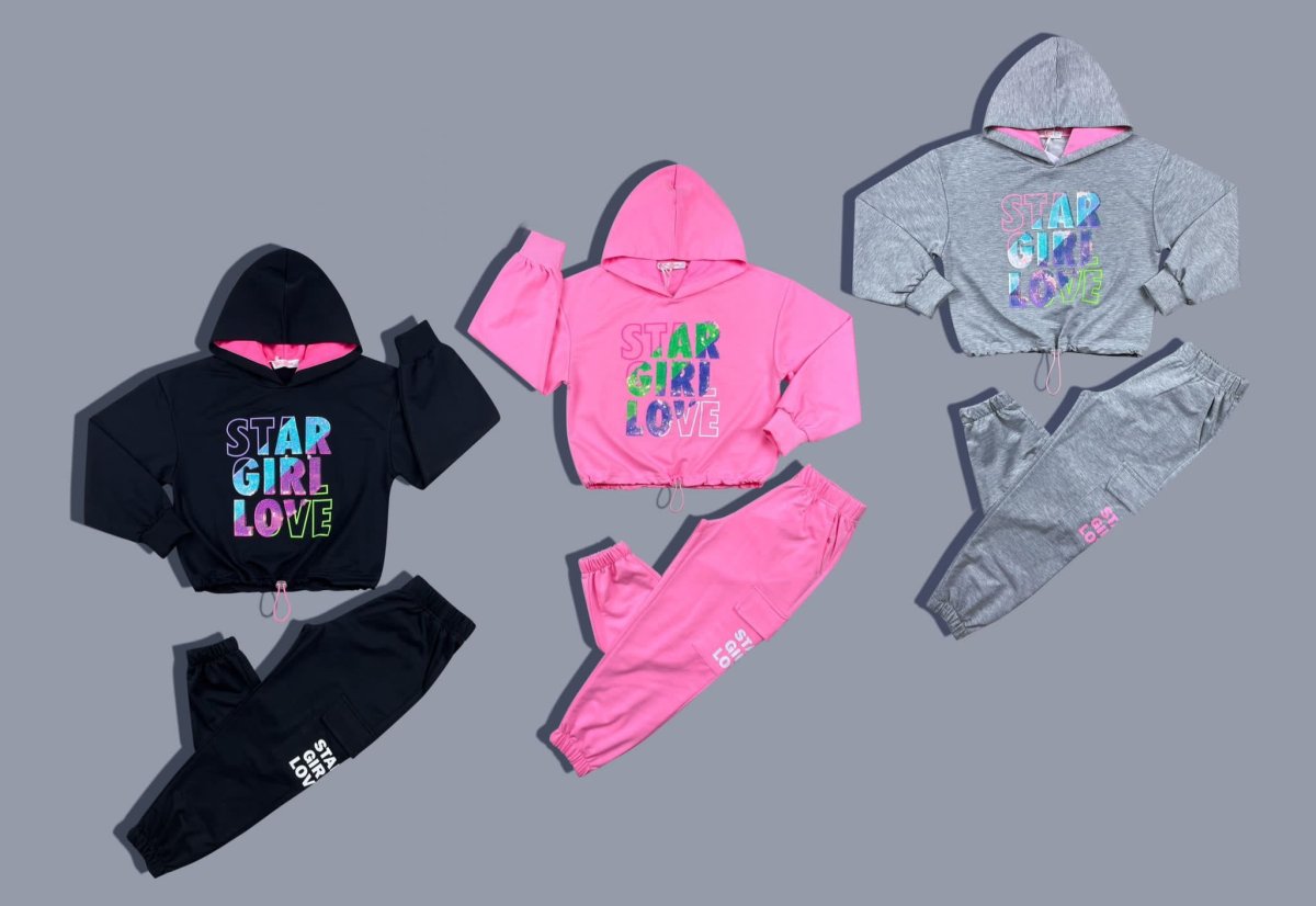 Tuta bimba in cotone garzato, felpa leggermente corta con polsino ed elastico regolabile in vita; pantalone largo con tasconi laterali e caviglia con elastico. 3 varianti di colore.