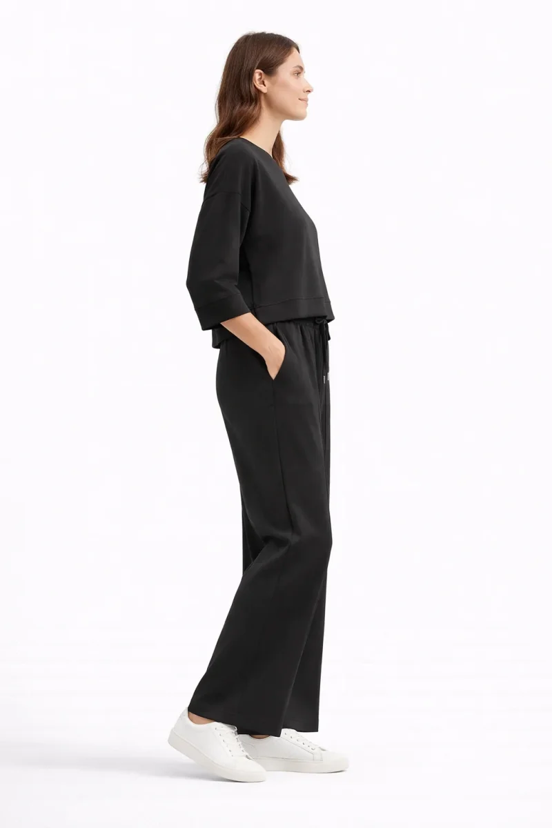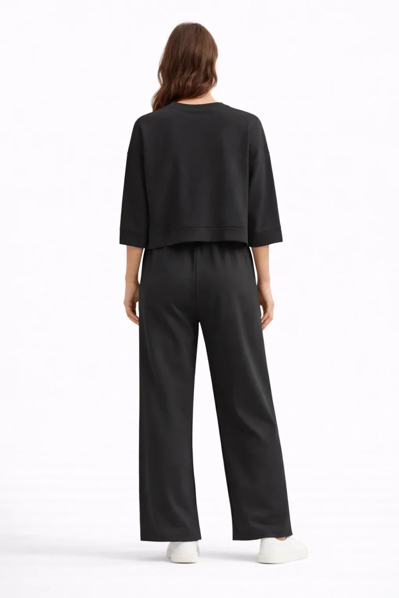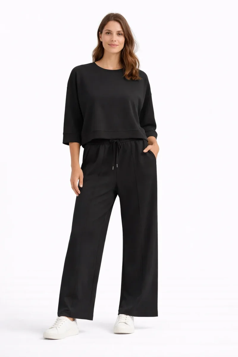 Felpa con manica 3/4 e linea leggermente corta, pantalone a gamba dritta con elastico e coulisse in vita.